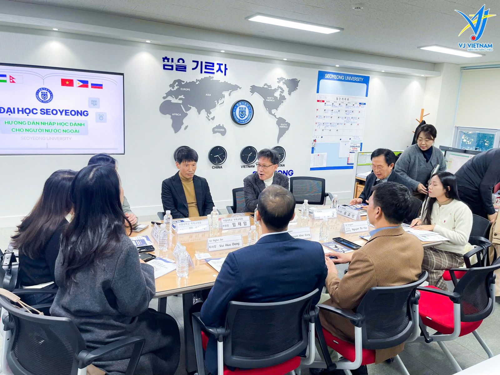 Tại buổi làm việc, hai bên đã tập trung trao đổi chi tiết về các chương trình đào tạo hiện đang được triển khai tại Đại học Seoyeong, bao gồm nội dung học tập, phương pháp giảng dạy và yêu cầu đầu vào đối với sinh viên quốc tế. Bên cạnh đó, môi trường học tập, cơ sở vật chất, ký túc xá và đời sống sinh hoạt của sinh viên cũng được phía nhà trường chia sẻ cụ thể.