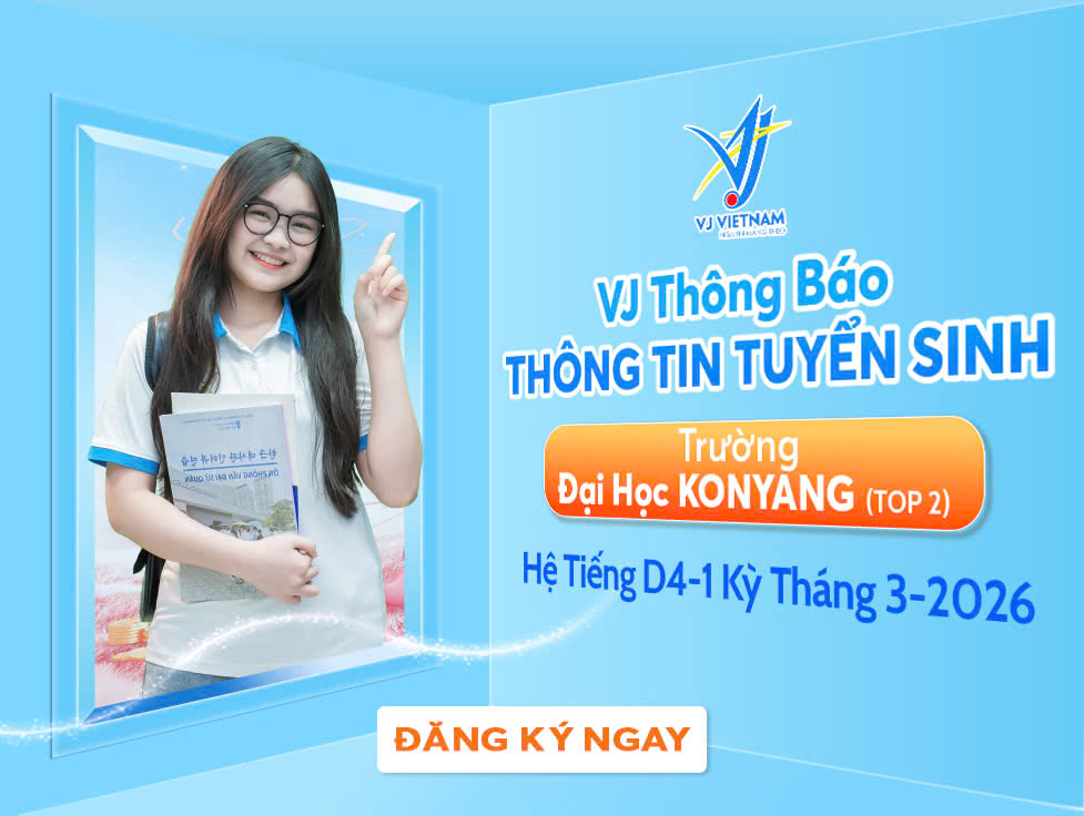 Global - VJ Vietnam chính thức công bố tuyển sinh chương trình du học Hàn Quốc hệ tiếng D4-1 tại Trường Đại học Konyang cho kỳ nhập học Tháng 3/2026. Đây là cơ hội hiếm có dành cho các bạn trẻ mong muốn bắt đầu hành trình du học tại một trong những đại học tư thục xuất sắc nhất Hàn Quốc, nổi bật với chất lượng đào tạo thực tiễn và môi trường học tập hiện đại.